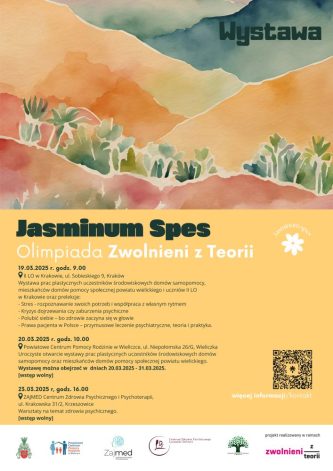 Powiatowe Centrum Pomocy Rodzinie w Wieliczce zaprasza na wernisaż prac plastycznych, których autorami są mieszkańcy ponadgminnych domów pomocy społecznej oraz ponadgminnych środowiskowych domów samopomocy z terenu Powiatu Wielickiego. Wernisaż odbędzie się w dniu 20.03.2025 roku o godz. 10.00 w siedzibie Powiatowego Centrum Pomocy Rodzinie w Wieliczce, ul. Niepołomska 26G. Wernisaż organizowany jest w ramach projektu społecznego Jasminum Spes w ramach Olimpiady Zwolnieni z Teorii realizowanego przez uczniów II Liceum Ogólnokształcącego w Krakowie. Patronat nad projektem objęło Powiatowe Centrum Pomocy Rodzinie w Wieliczce i Centrum Zdrowia Psychicznego Leonardo da Vinci w Wieliczce.