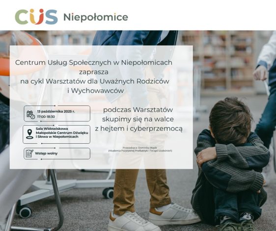 Centrum Usług Społecznych zaprasza rodziców i nauczycieli do udziału w kolejnym spotkaniu w ramach Warsztatów dla Uważnych Rodziców i Wychowawców. Odbędą się one 13 października 2025 r w godzinach 17.00 – 18.30 w Sali Widowiskowej Małopolskiego Centrum Dźwięku i Słowa w Niepołomicach. Temat październikowy to „Moda na nieprzeMOC”